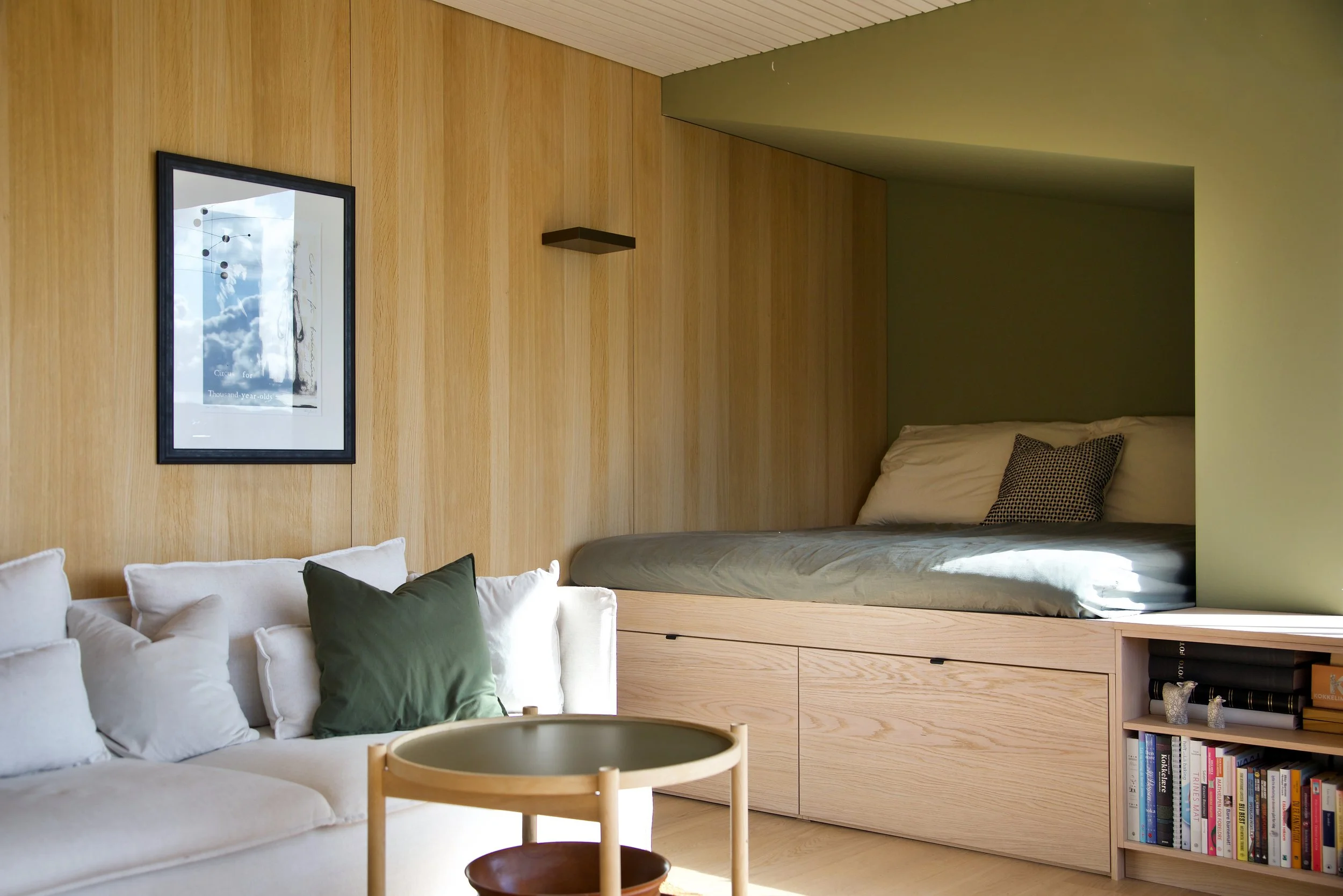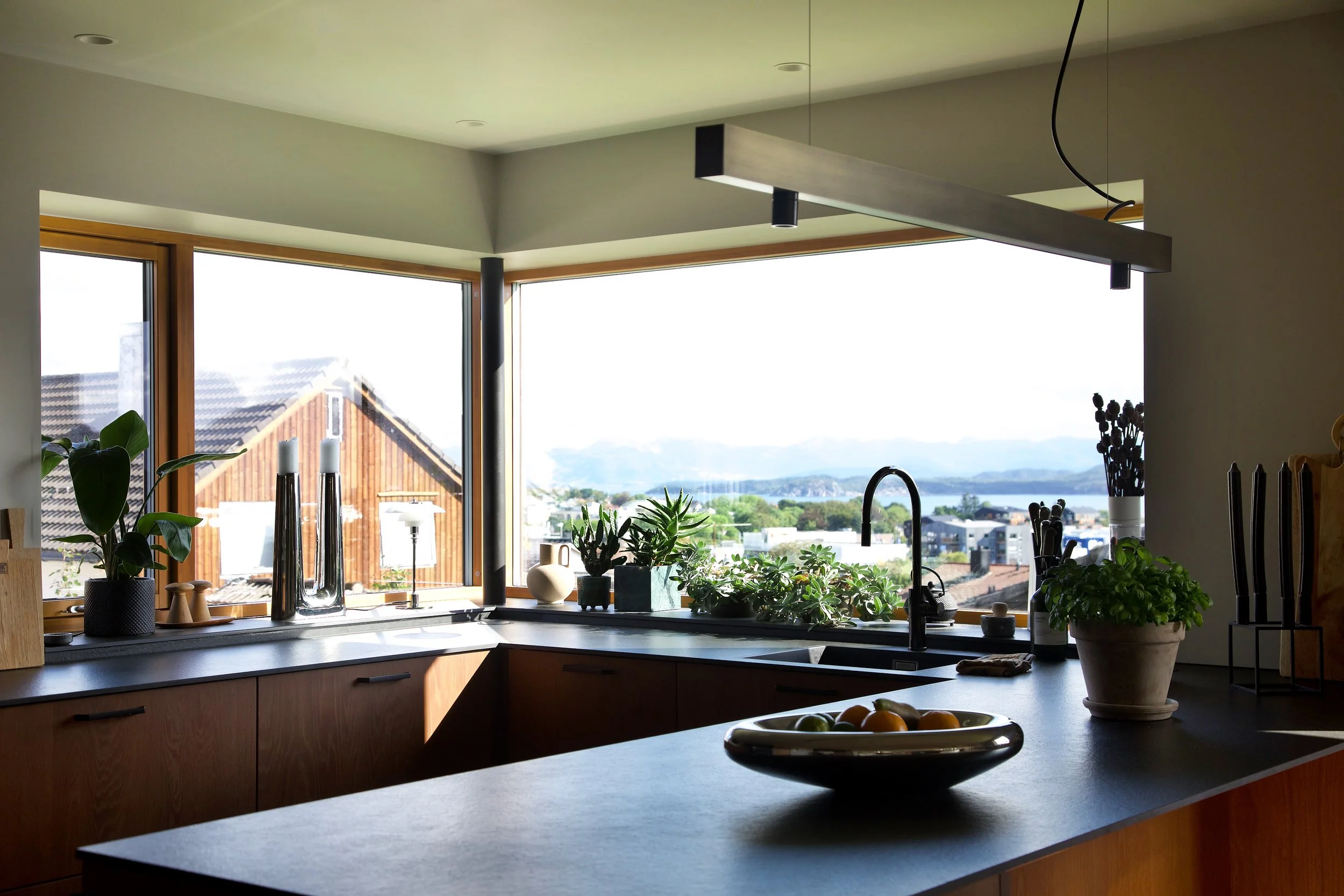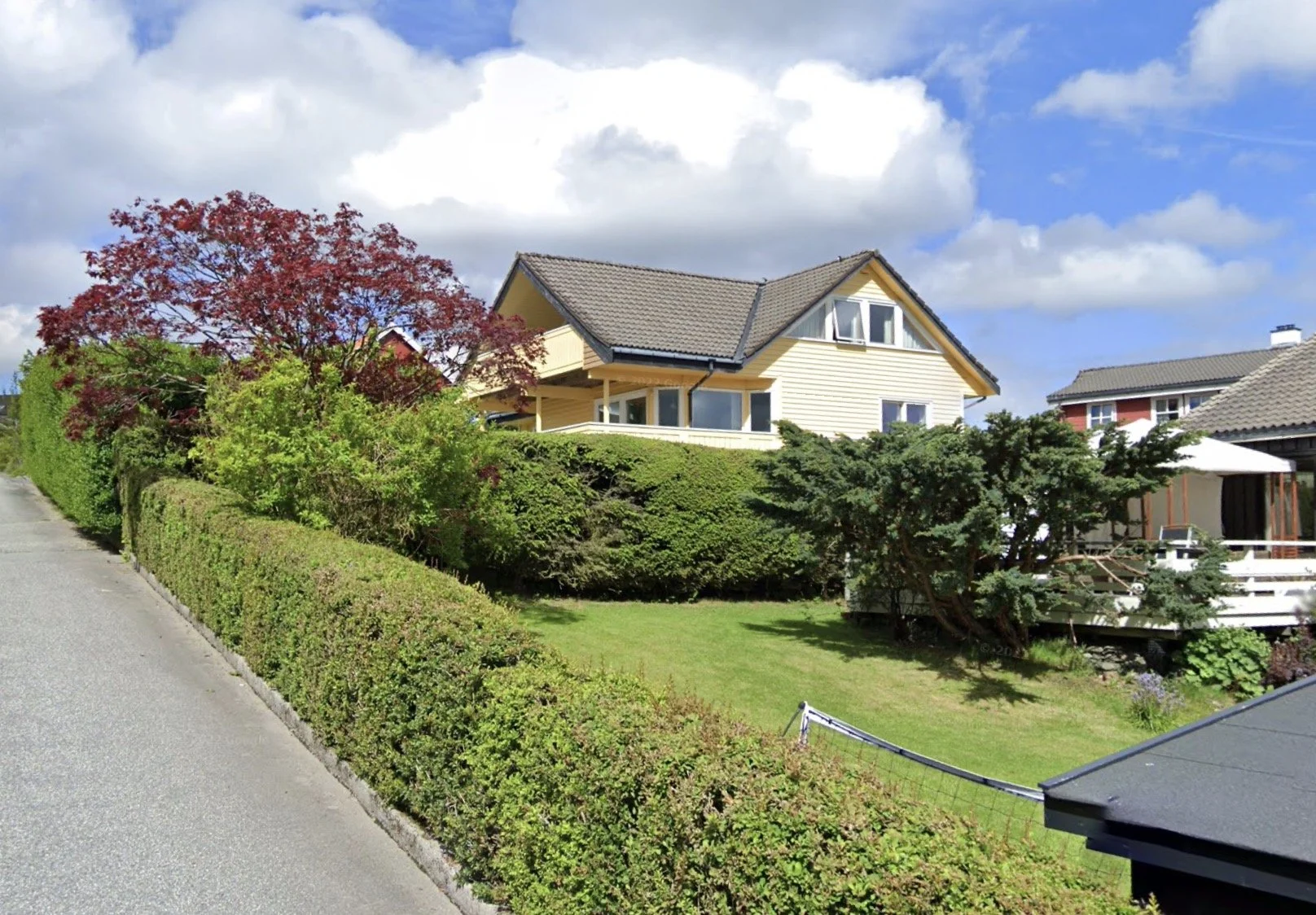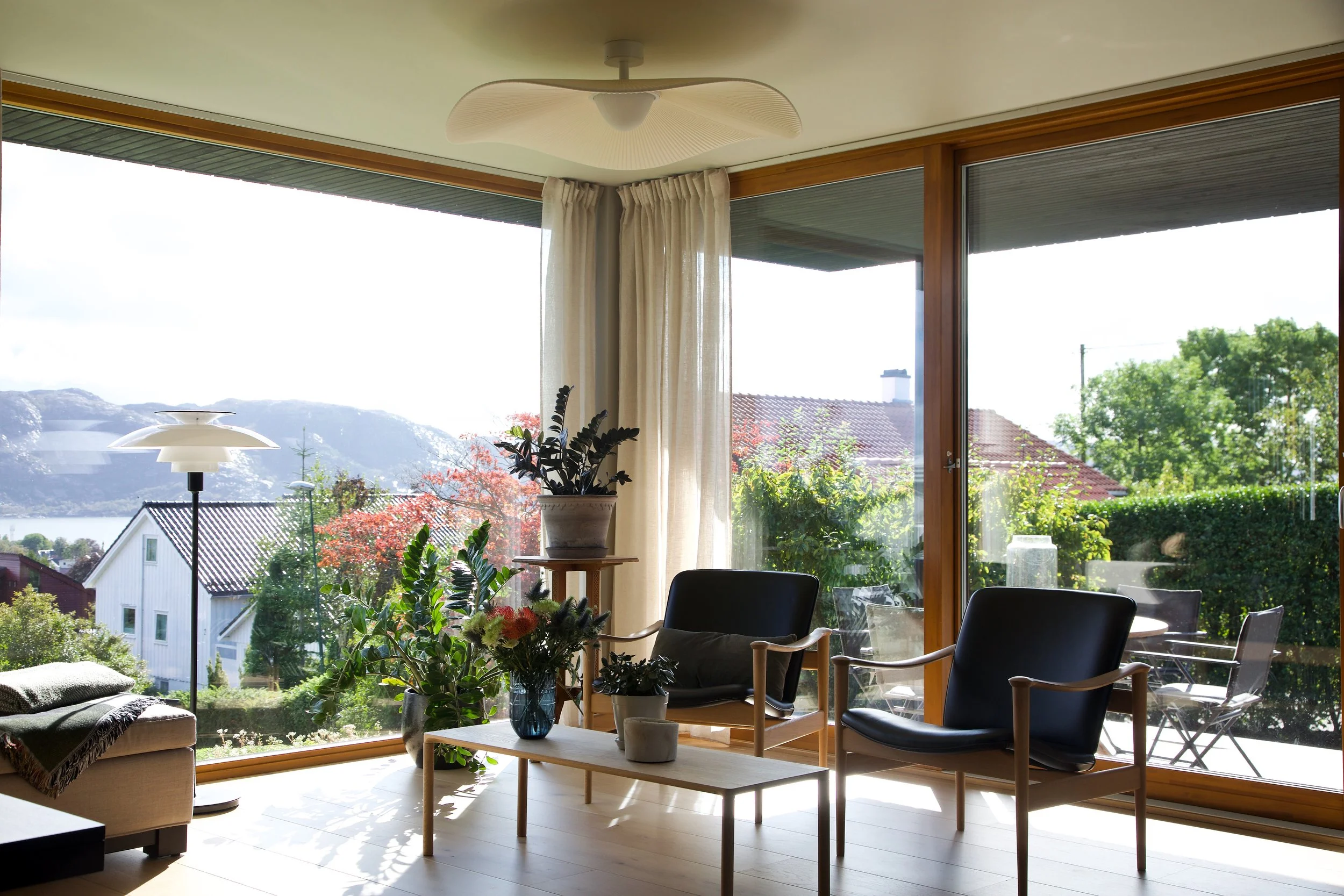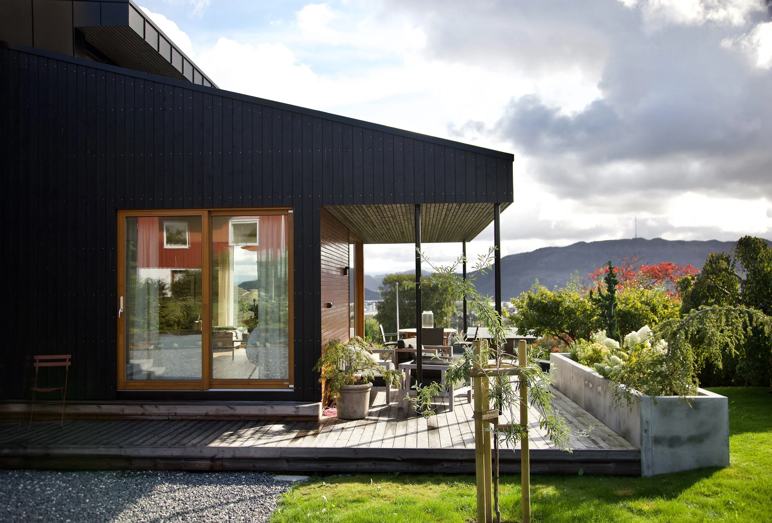 Mindre tilbygg mot sør utvider hovedetasjen og gir direkte utgang til overdekket terrasse og hage.