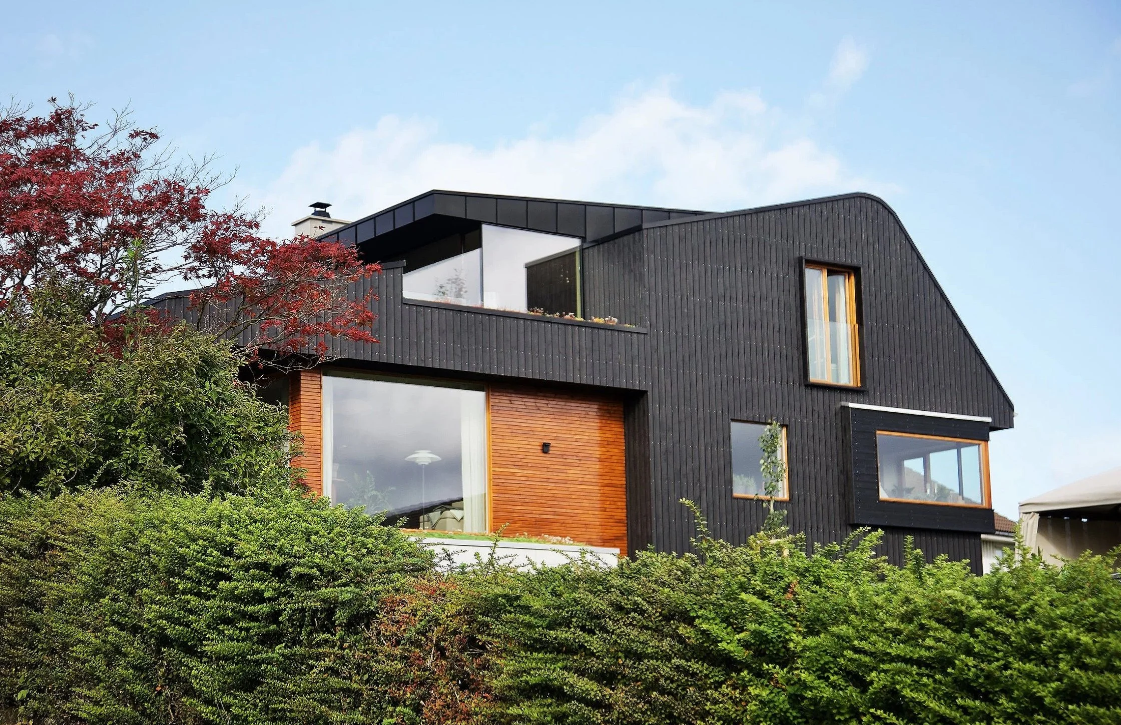 Radikal ombygging av enebolig fra 80-tallet, der eksisterende tak og loftetasje ble revet og erstattet med en ny, moderne takform med takopplett.