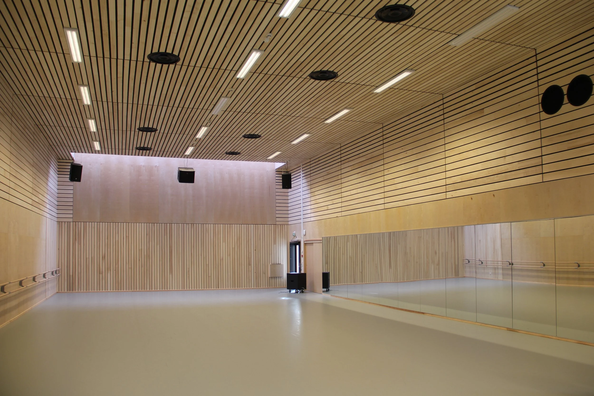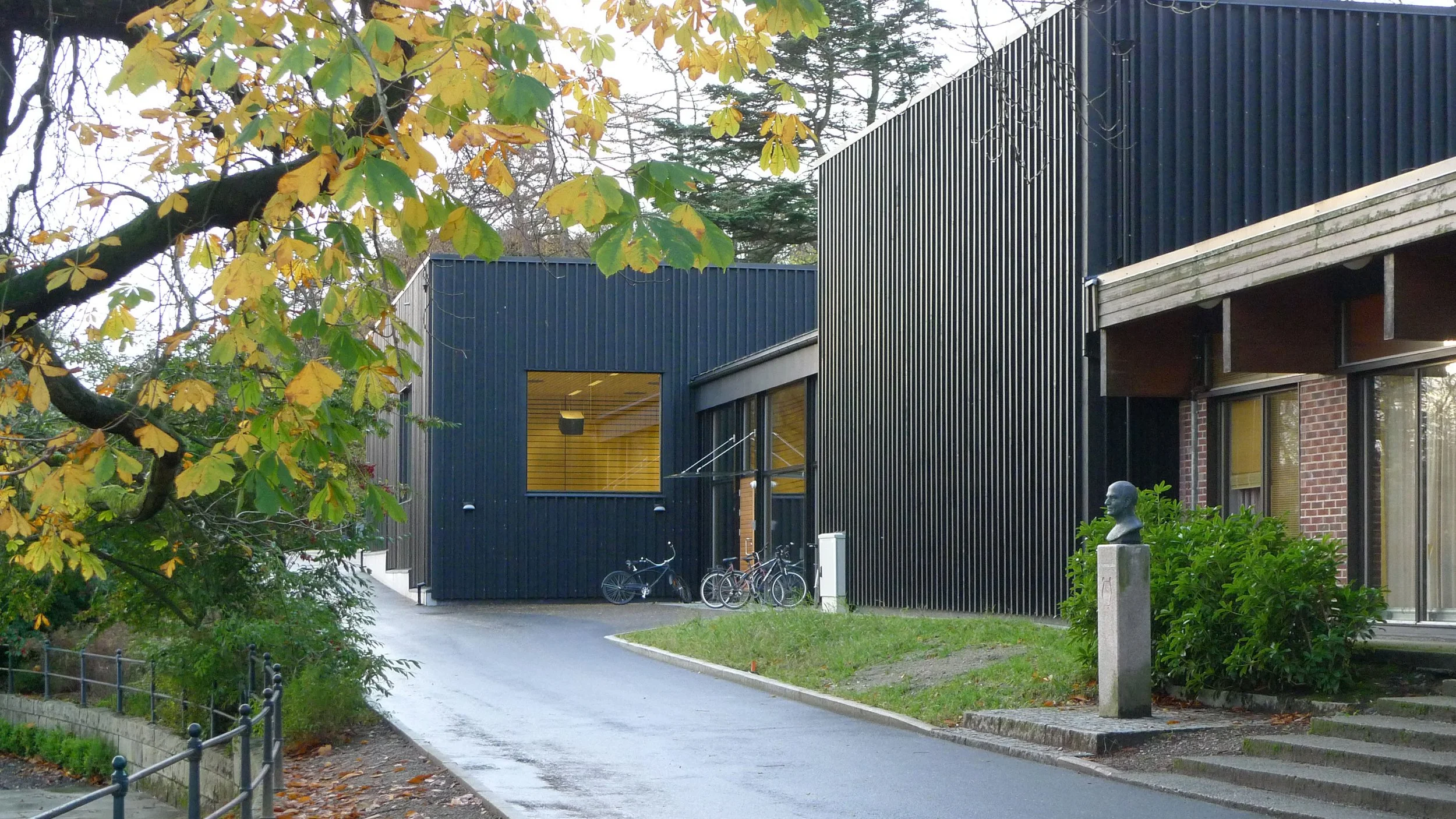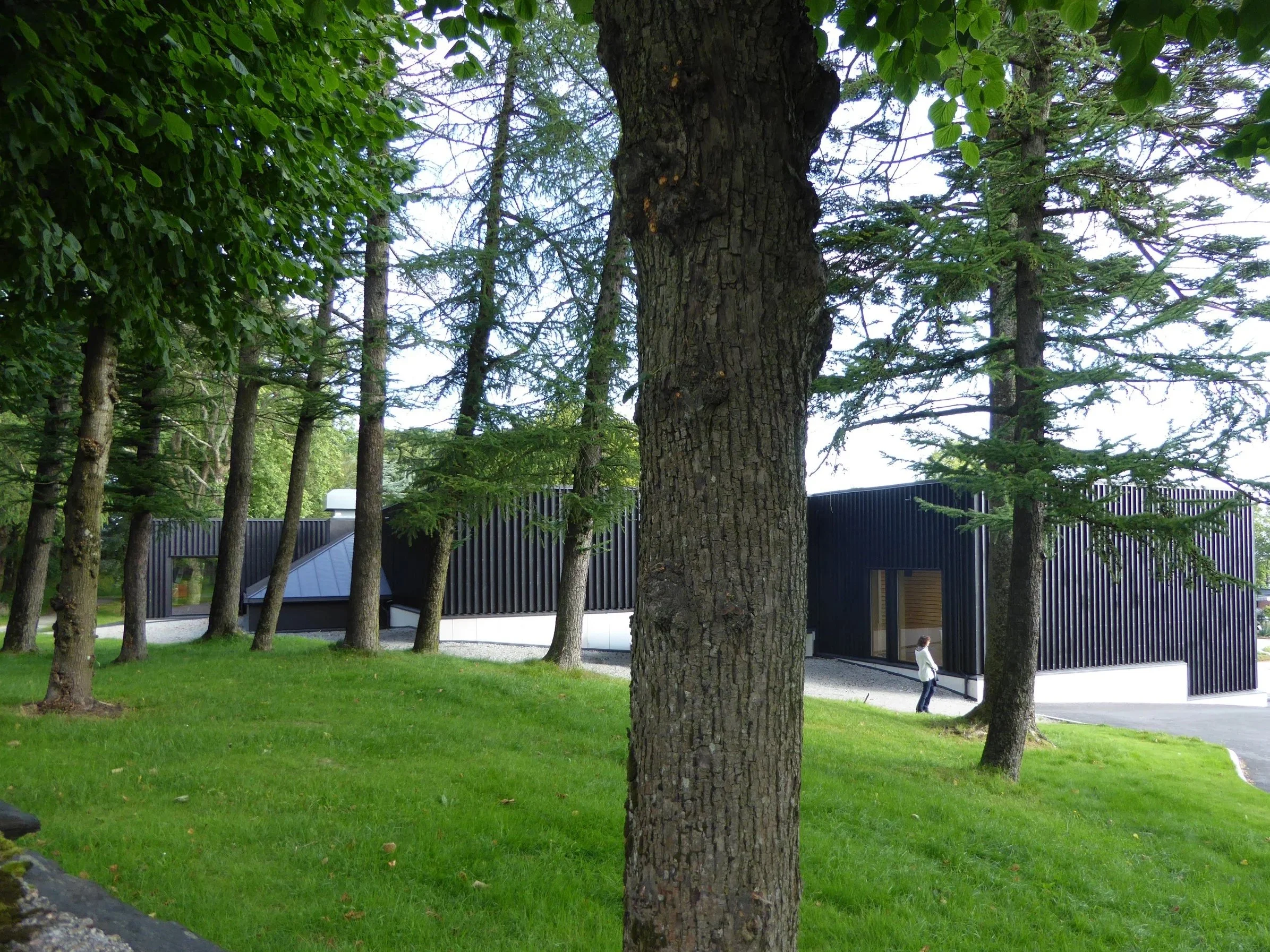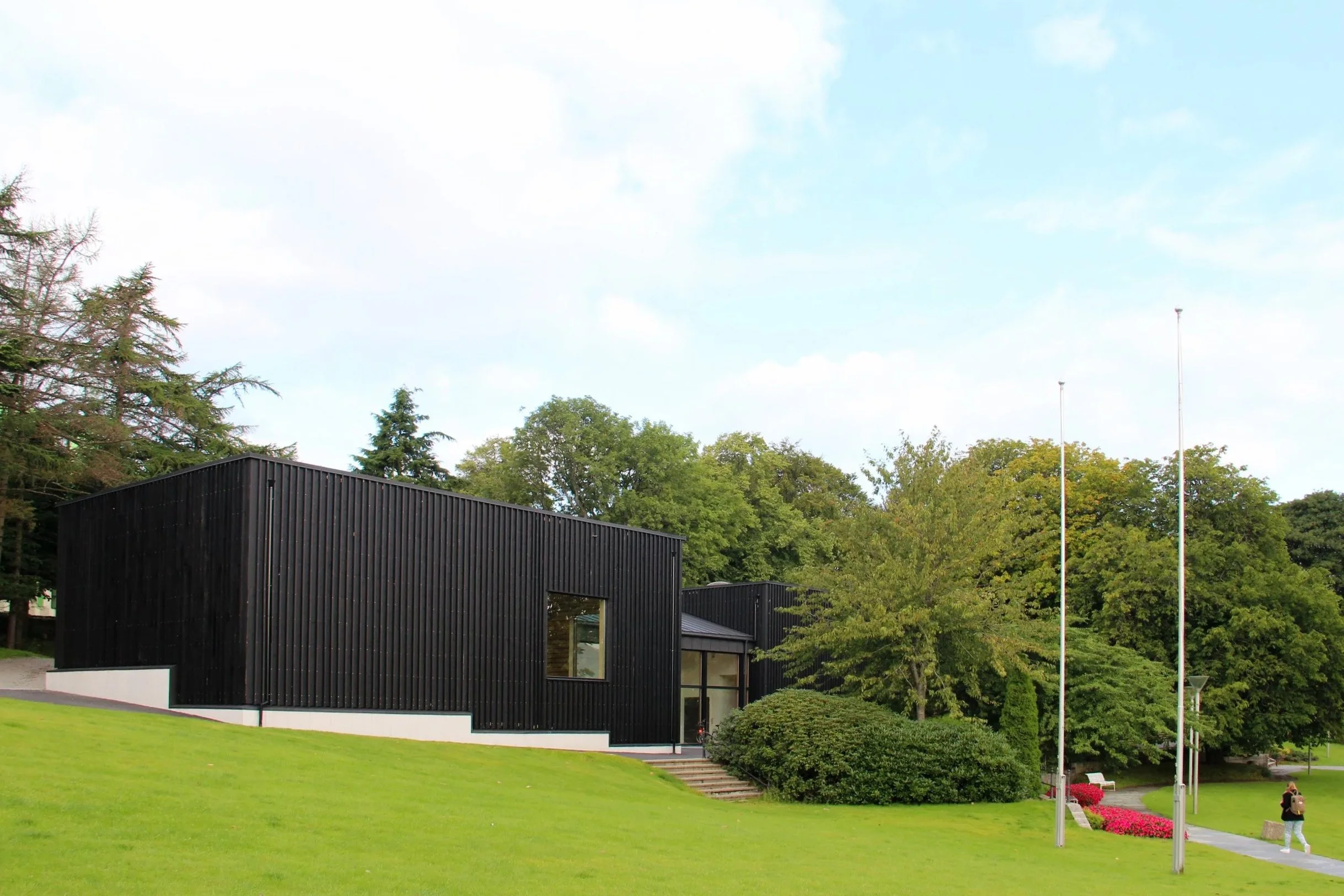 Tre sorte rektangulære bokser med stående lektekledning utgjør salene, mens mellomarealet kledd med sink inneholder garderobe og foajé.