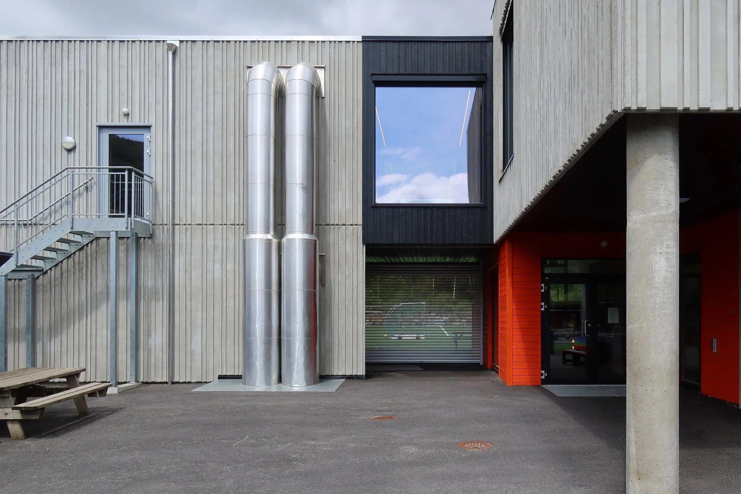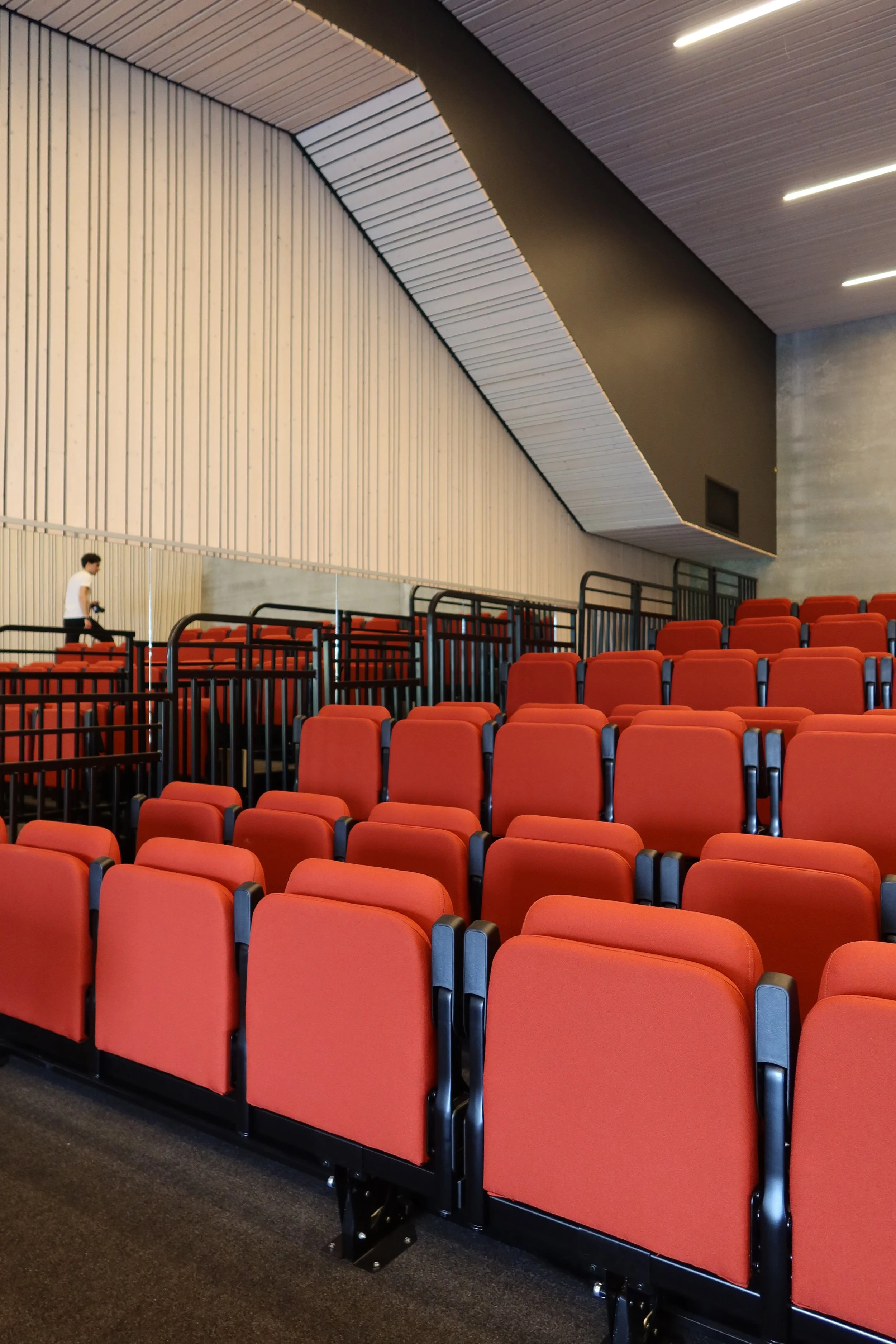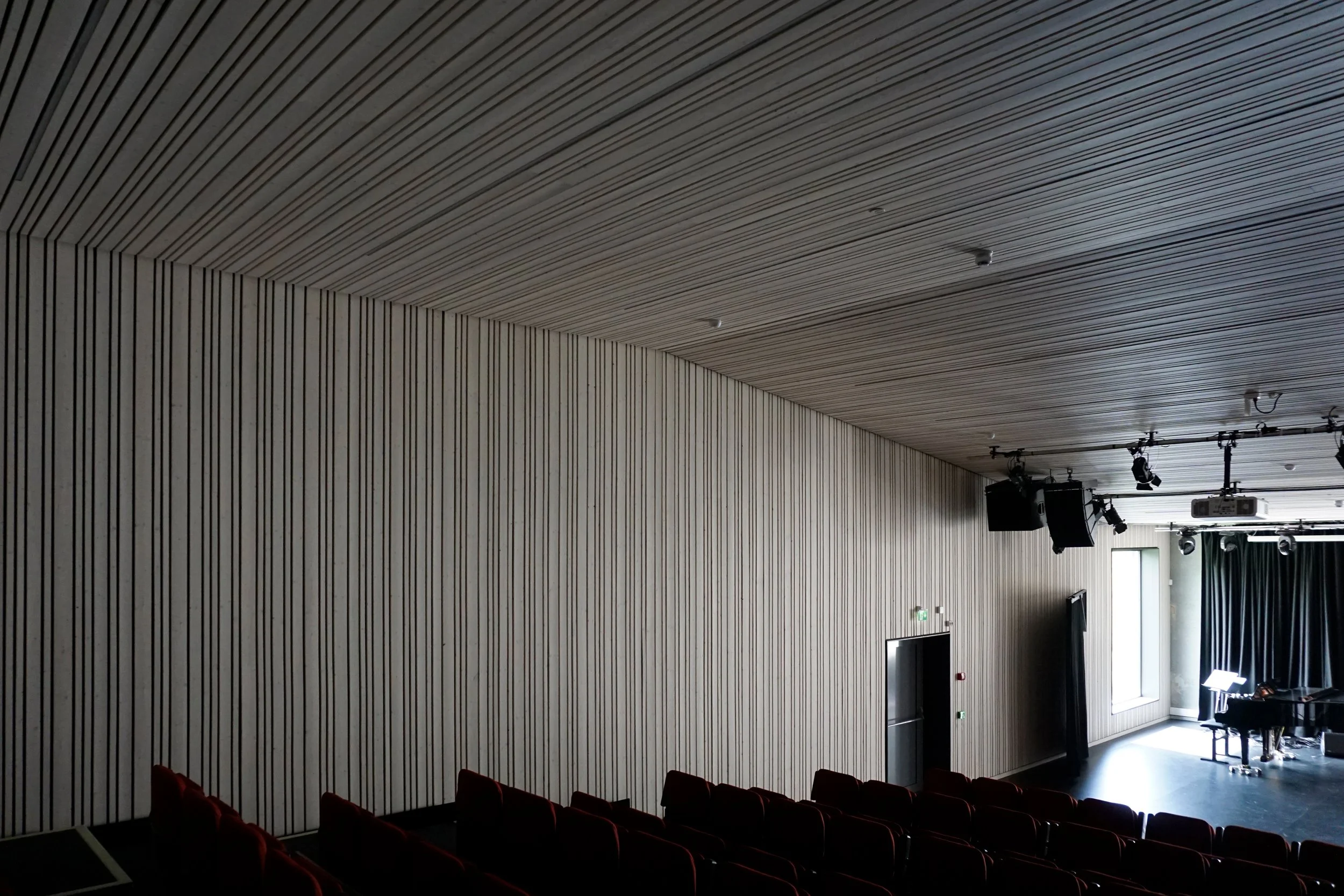 To bygningsvolumer med separate innganger knyttes sammen med bro i 2. etasje. Scenerommet fremheves med utkragning og hevet tak for teleskoptribune, med fokus på god akustikk og ekte materialer.