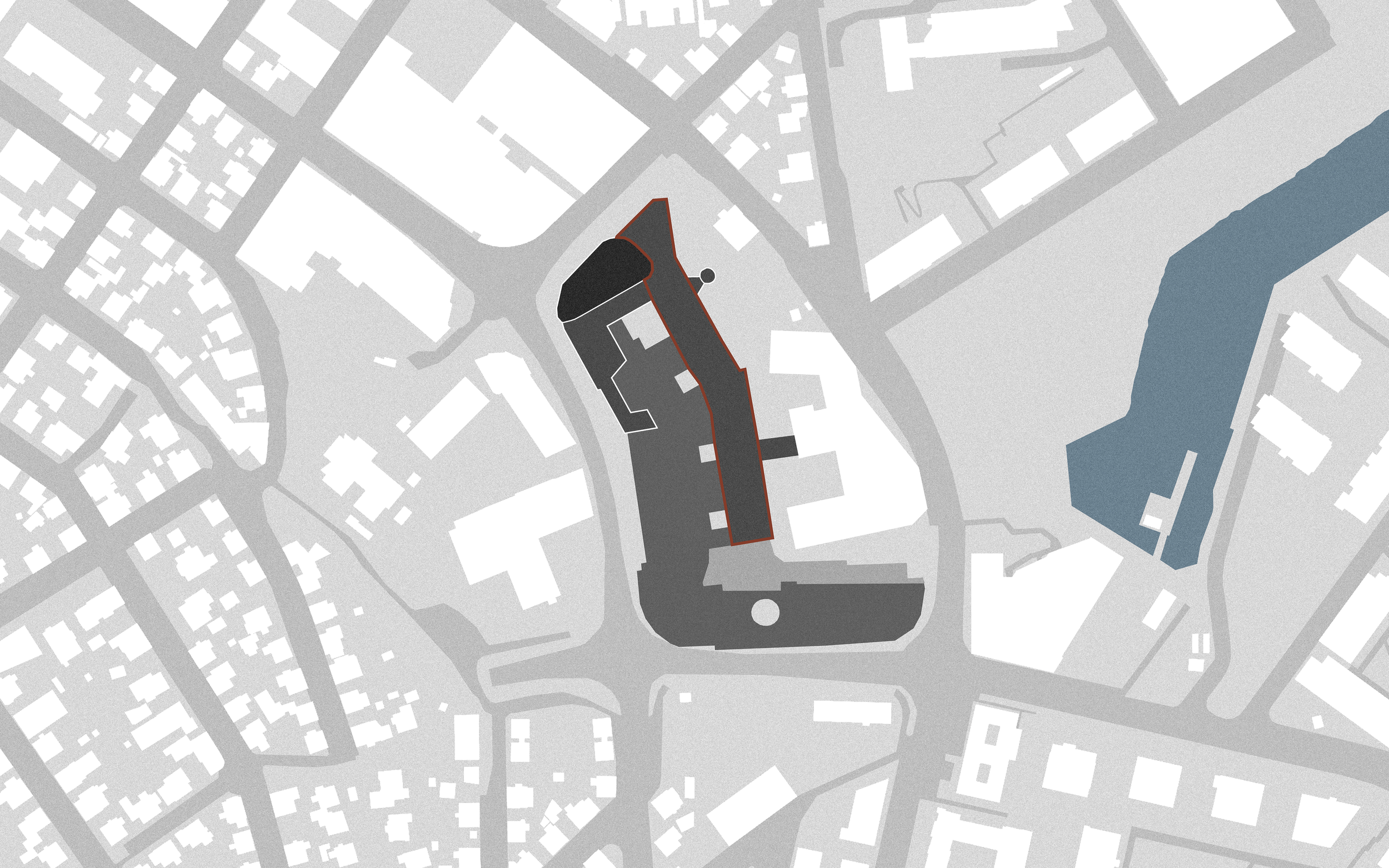 Skoleanlegg der bygget skaper en tydelig gangforbindelse mellom ny bebyggelse og sykehjemmet.