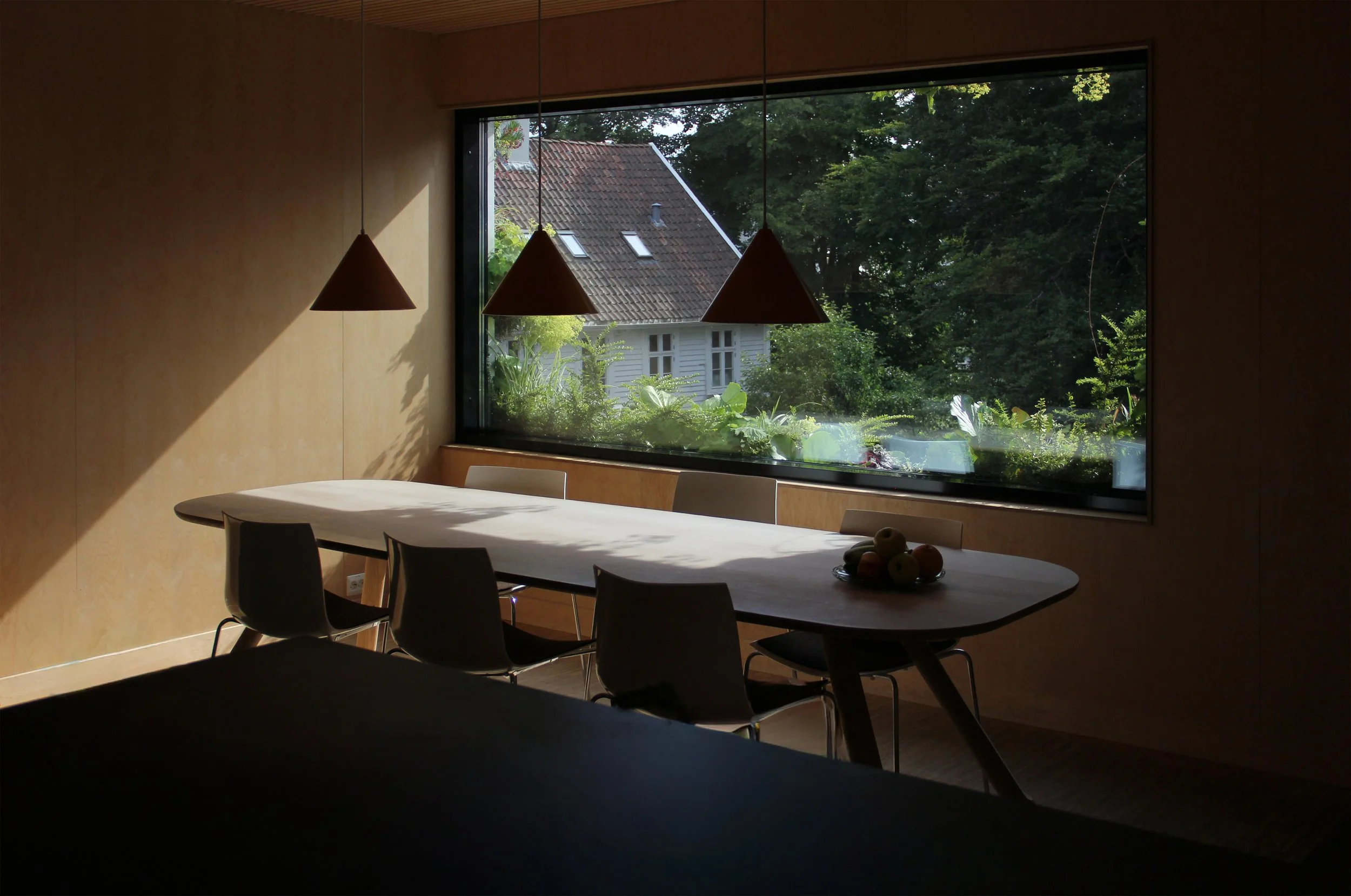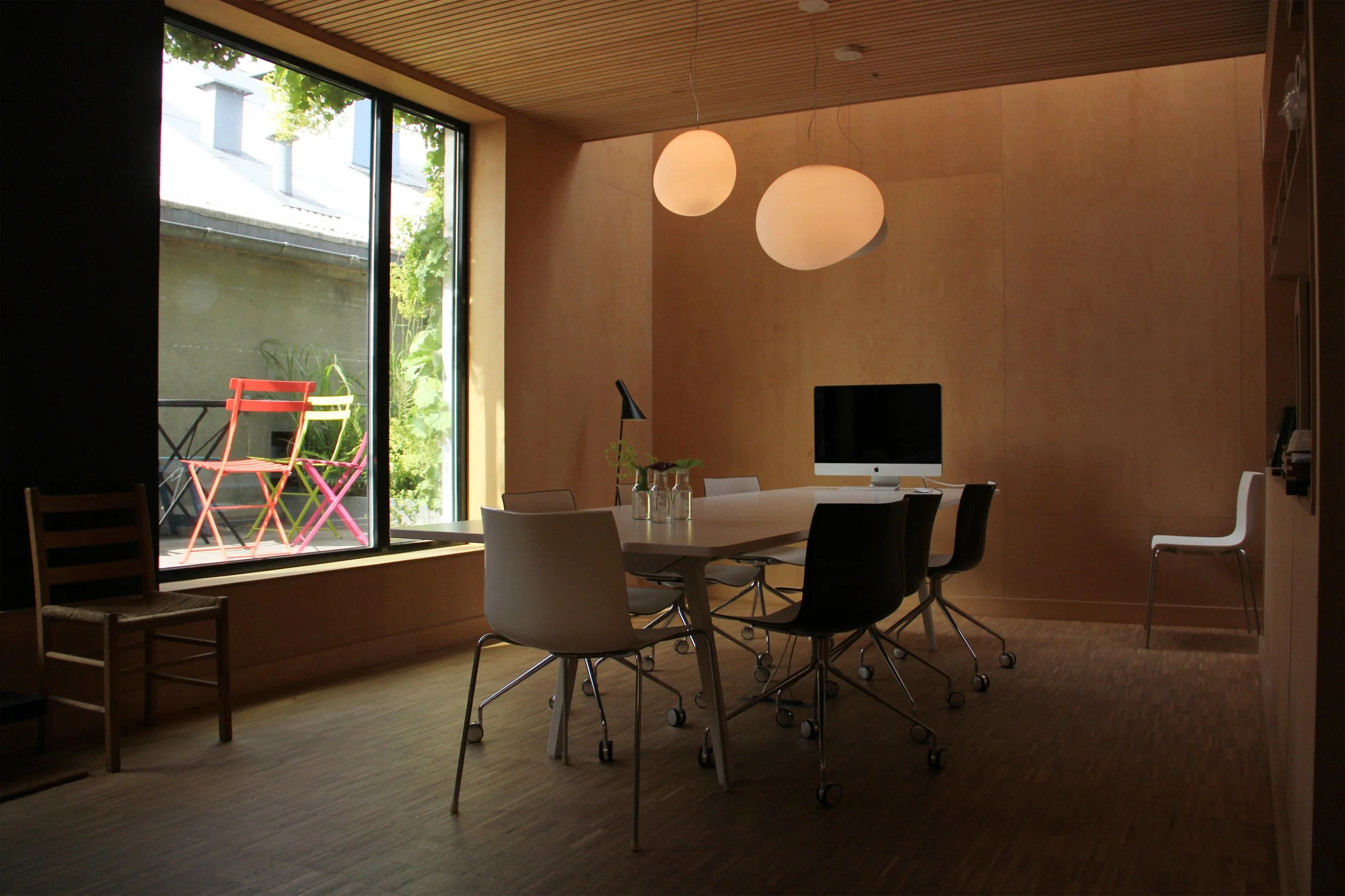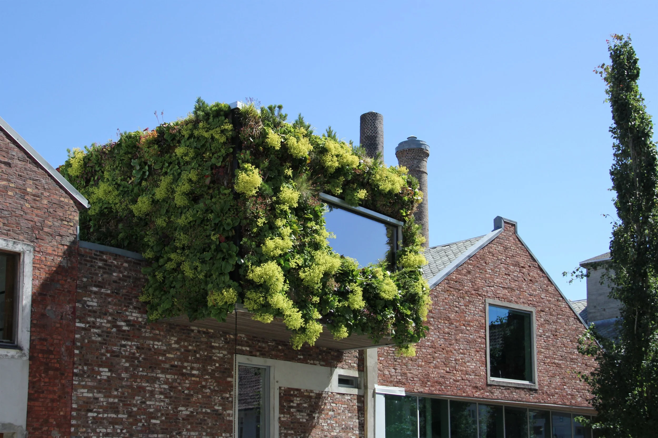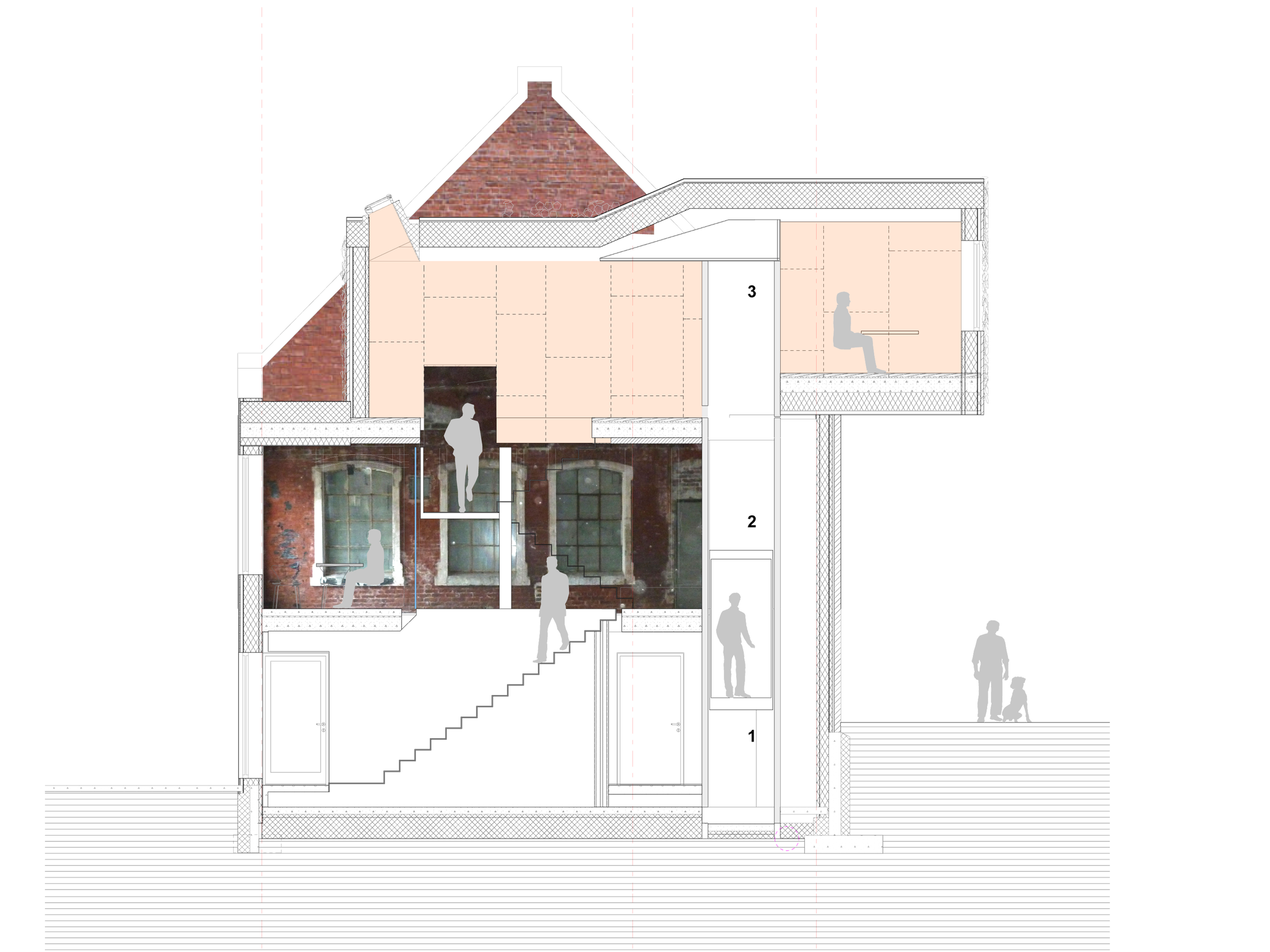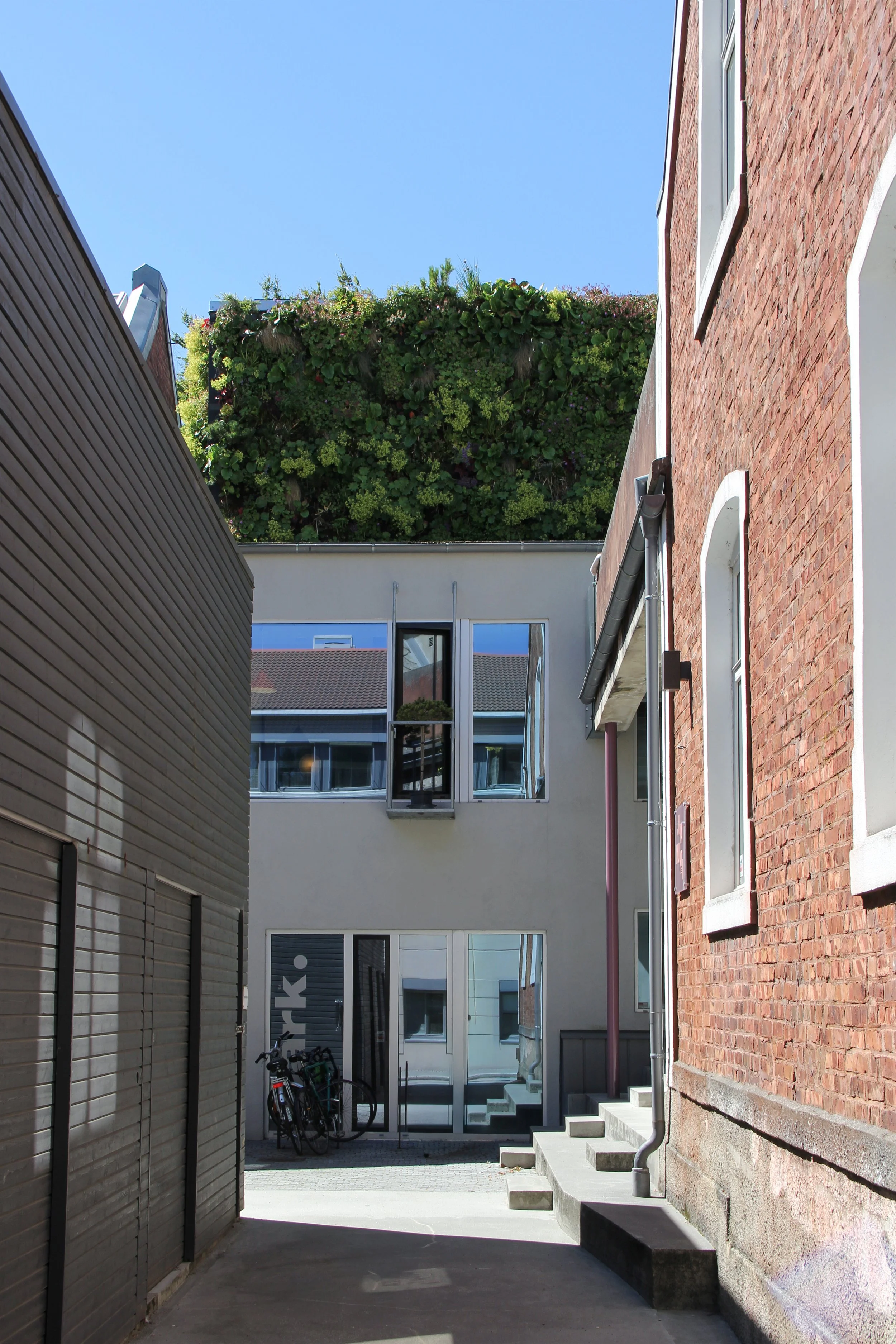 Det opprinnelig volumet på to etasjer er restaurert. Fasaden mot gårdsrommet beholder uttrykket, mens fasaden mot parken får mer vindusareal. Et grønt, plantet volum markerer inngangen og fremstår som en del av parken.